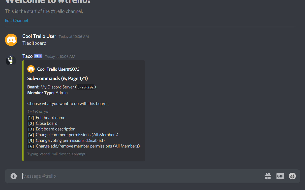 You can edit boards via the /edit-board command. You can edit the following from Trello boards: