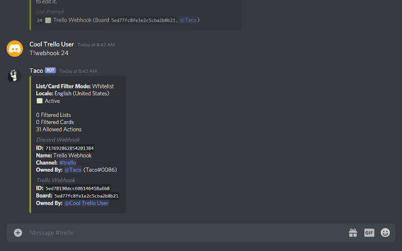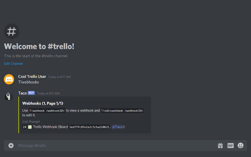 After creating a webhook, a message will be sent on the new webhook confirming the setup.